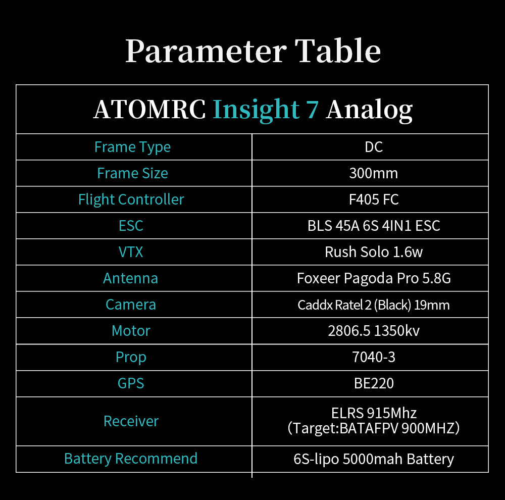 The ATOMRC Insight 7 Analog racing drone offers the perfect combination of power and control for an amazing FPV flight experience. Featuring a 300mm frame, F405 FC flight controller, BLS 45A 6S 4IN1 ESC, Rush Solo 1.6w VTX, Foxeer Pagoda Pro 5.8G antenna, Caddx Ratel 2 (Black) 19mm camera, 2806.51350kv motor, 7040-3 props, BE220 ELRS, and a 6S-lipo 5000mah battery, you'll be able to reach speeds of up to 75 mph with accurate and precise control.