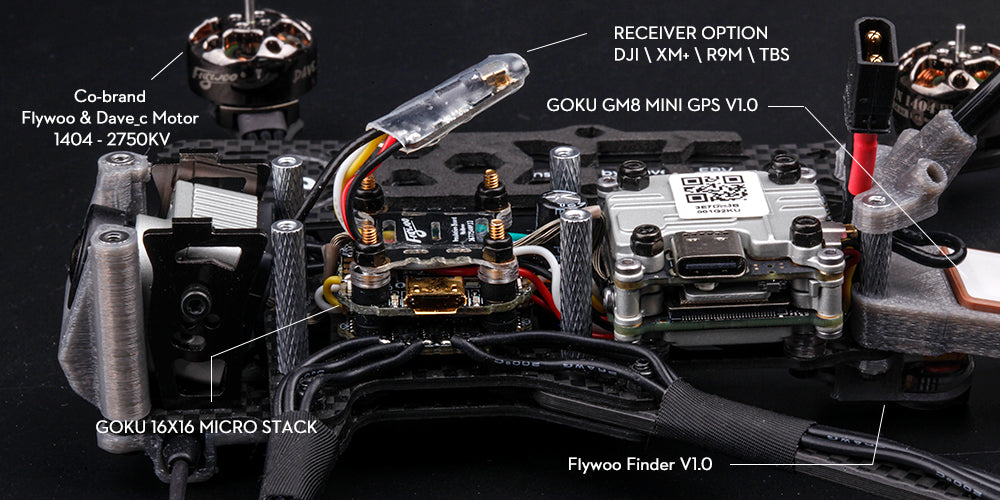 1\ The lightweight 4-inch quad below 250g even if you connect with the battery, meet the current requested of FAA rules. Easy to control and long flight time, we strongly recommend to FPV beginners and pilots who like to cruise!2\ Equipped with GOKU 16X16 MICRO STACK, and NIN 1404 v2-2750kv, support 4s battery. You can get up to 20 minutes for cruising! So this is a quad that is very suitable for FPV beginners and long range enthusiasts!3、We recommend installing side carbon fiber plate to increase the strength and stability of the Arm.4、Flywoo Finder v1.0 how to work?